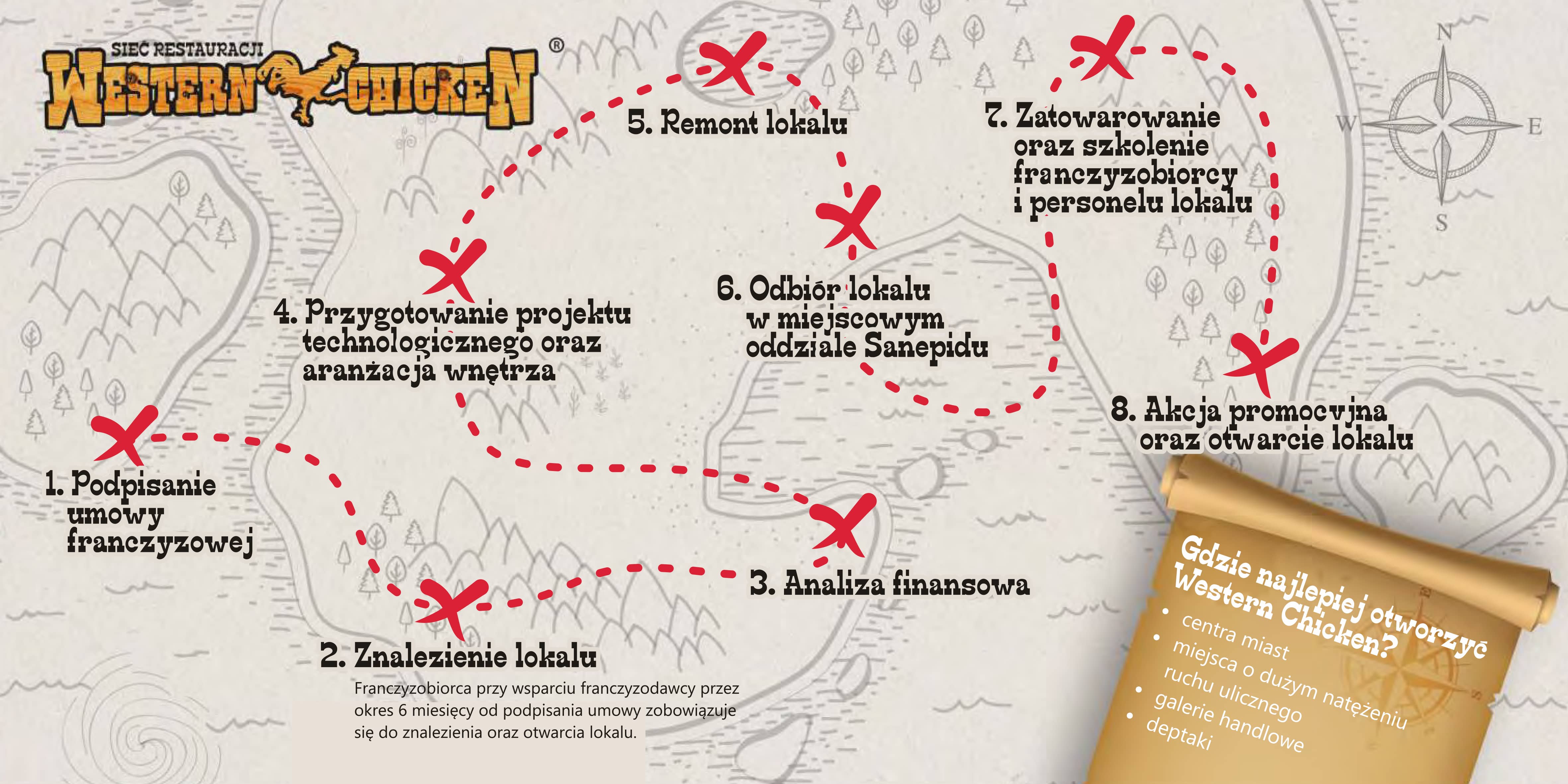 5. Dysponując projektem można przystąpić do wykonania remontu lokalu. Remont może wykonać firma polecona przez naszą sieć lub można go wykonać we własnym zakresie. Aranżacja wnętrz musi zostać wykonana zgodnie z wymaganiami sieci określonymi w umowie franczyzowej. Lokale sieci Western Chicken stylistyką nawiązują do dzikiego zachodu.
